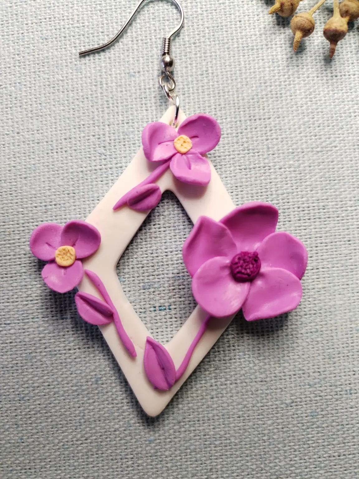 Diese einzigartigen Statement-Ohrringe werden von Hand aus Polymer Clay gefertigt. Ihre offene Rautenform bietet die perfekte Bühne für zarte Blüten in Flieder- und Orchideentönen. Jede einzelne Blüte ist liebevoll modelliert und bringt die leise Magie des Frühlings zum Ausdruck – in Form eines tragbaren Kunstwerks.