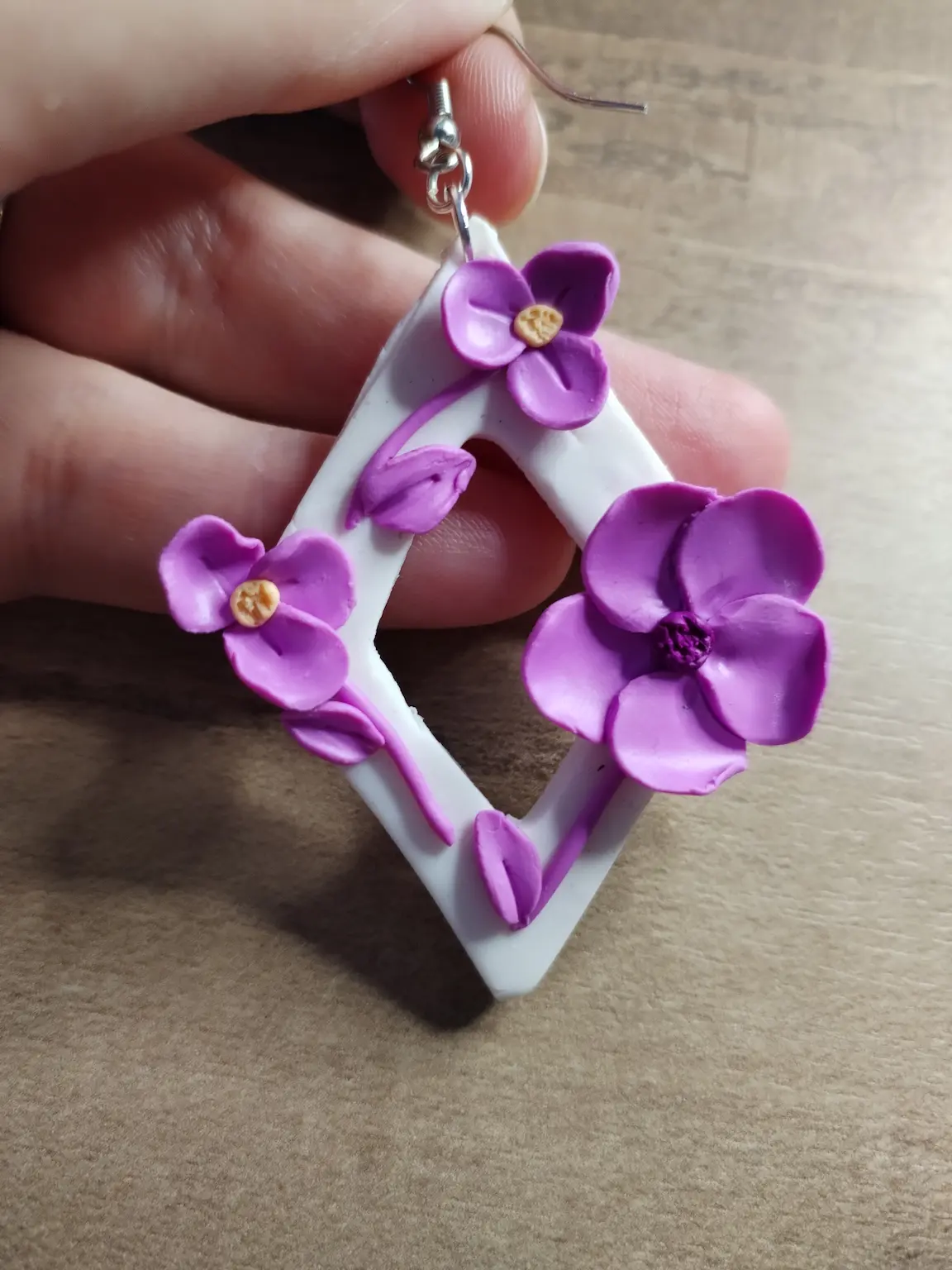 Handgemachte Statement-Ohrringe in zarten Lavendeltönen. Offene Rautenform mit floralen Details aus Polymer Clay – leicht, verträumt, einzigartig.