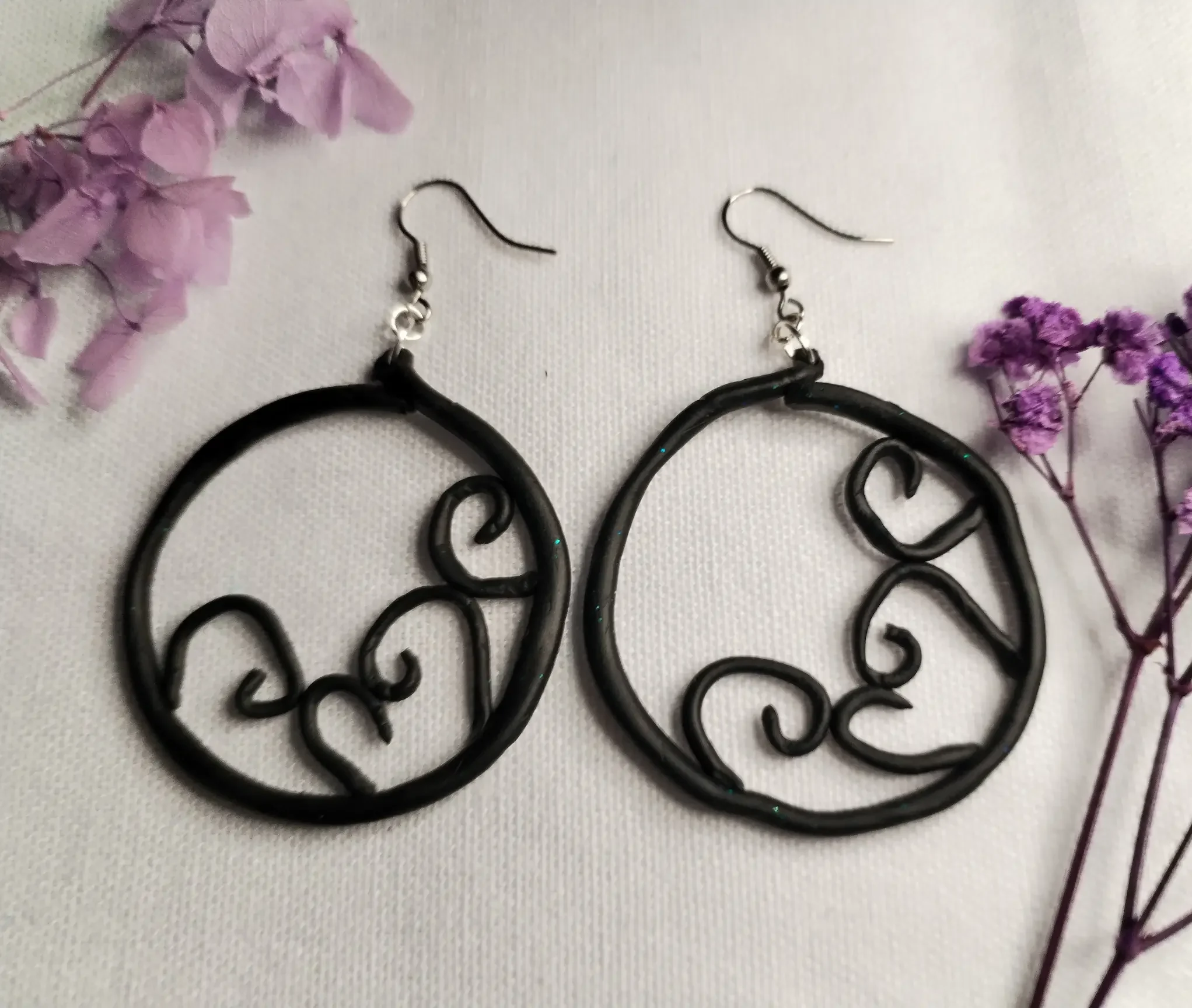 Jedes Paar wird sorgfältig von Hand aus leichtem Polymer Clay geformt. In tiefem Schwarz schlängeln sich feine Kurven innerhalb eines runden Rahmens – wie Ranken, die der Wind gezeichnet hat. Das Design wirkt gleichzeitig wild und elegant, organisch und strukturiert.